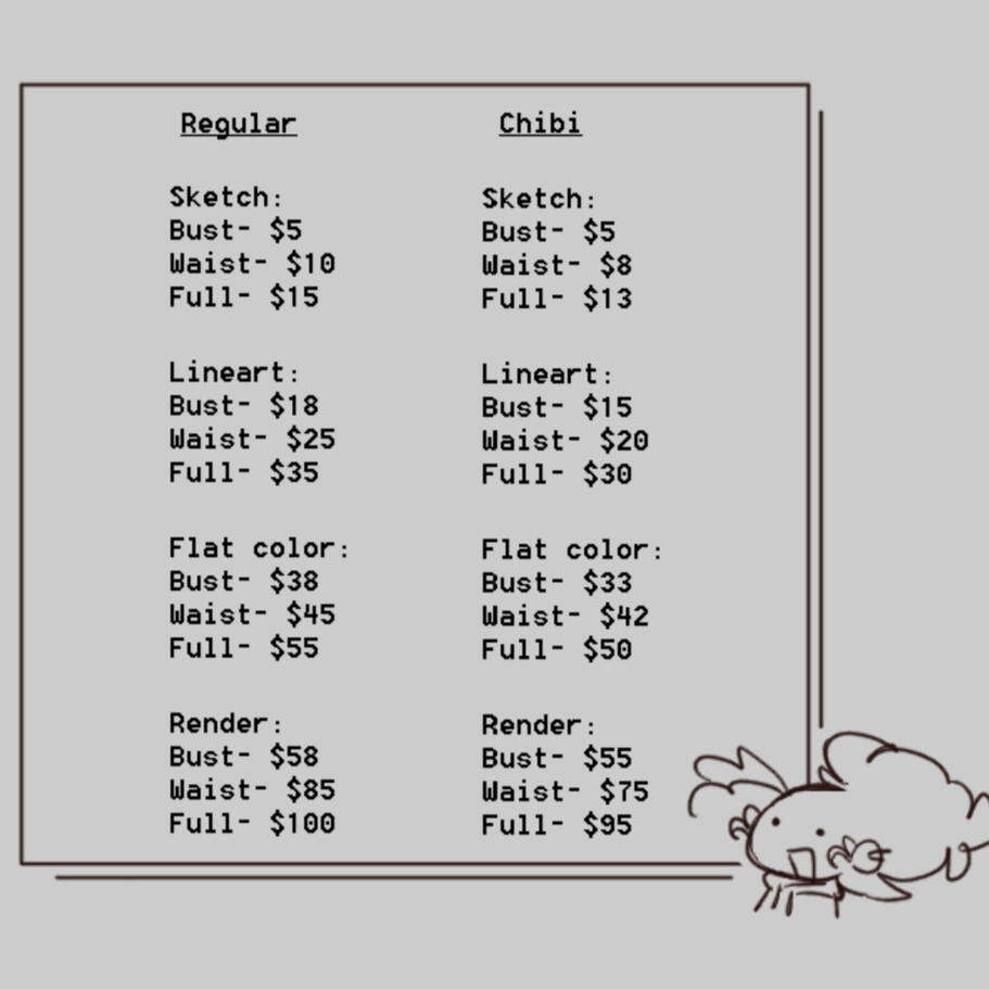 Before you commission me, please give me any details (i.e. poses, personality, etc.) about your character(s) and a visual reference sheet of your OC. (I will not accept only descriptions if you have no reference sheet.)